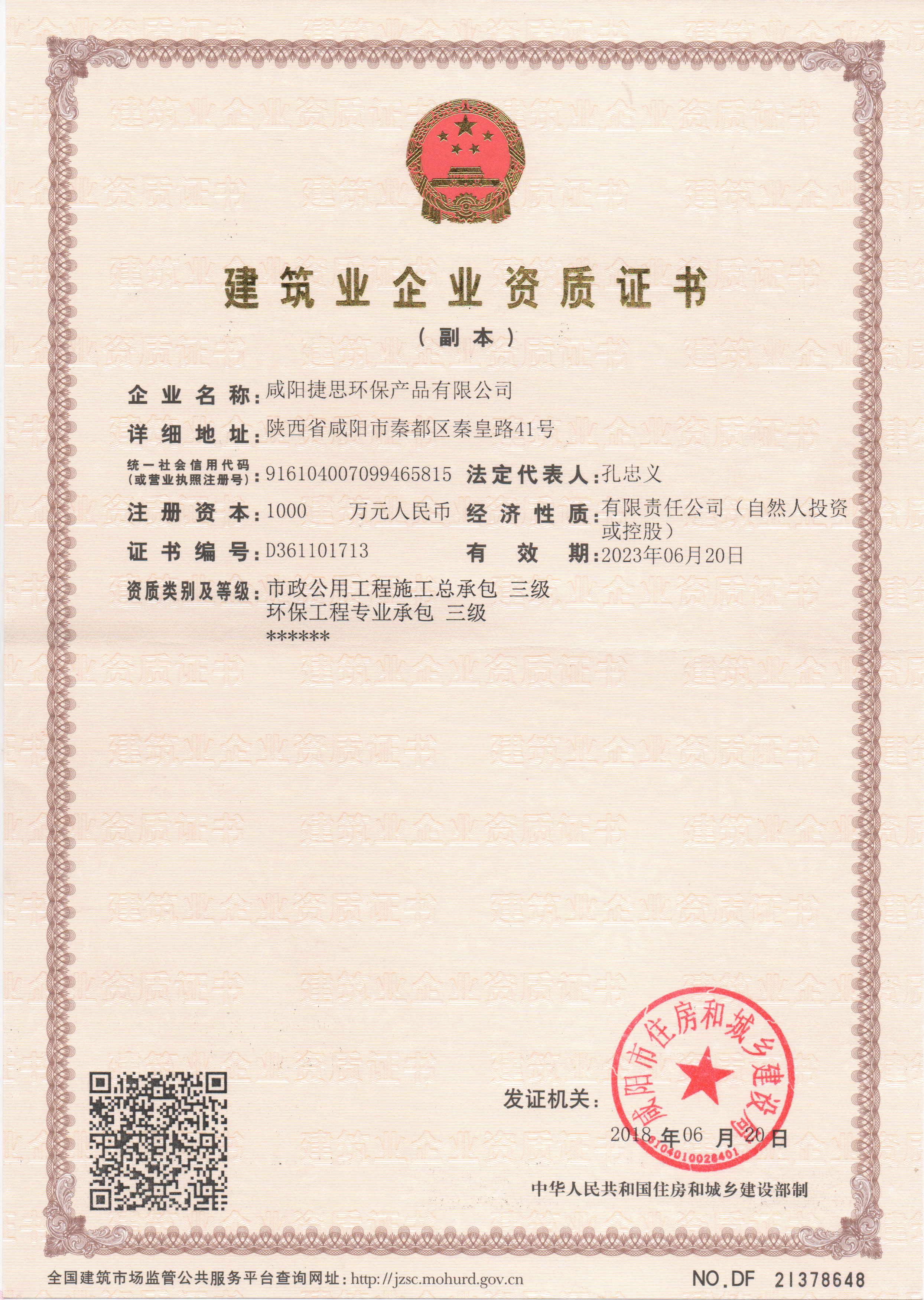 咸陽捷思環保產品有限公司,位于美麗的古城咸陽,創建于1998年,已獲得市政公用工程施工總承包、環保工程專業承包、安全生產許可證等。本公司長期致力于水處理設備的研究與開發,注重采用當今先進的技術,不斷的改進加工工藝,使我們的產品不斷推陳出新,在國內遙遙領先,在國際上已具有相當的競爭力,其良好的質量和優質的售后服務,贏得了全球用戶的認同及信賴。